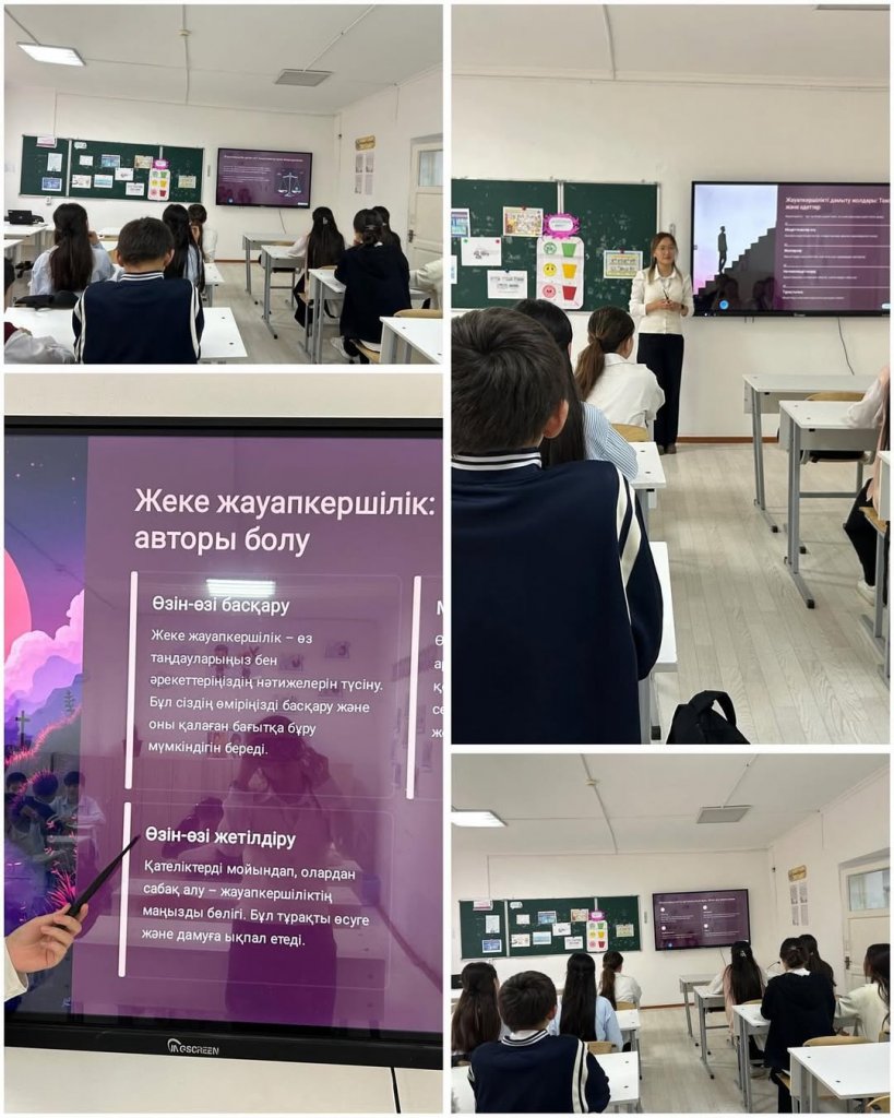 Тақырып: «Өз әрекеттері үшін жауапкершілік»Мақсаты: оқушыларға өз әрекеттері үшін жауапкершіліктің маңызын түсіндіру, дұрыс шешім қабылдауға баулу және жауапты азаматтық ұстаным қалыптастыру.
