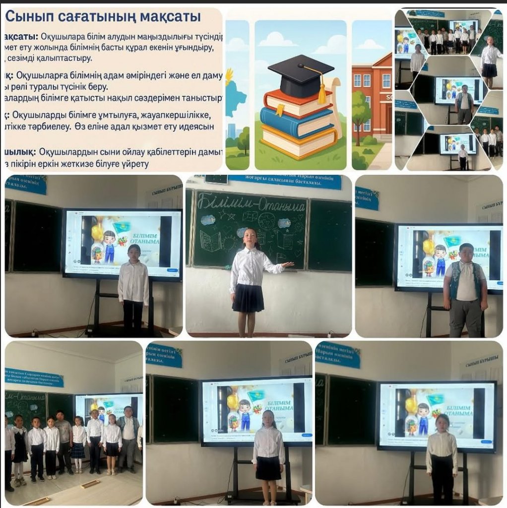 4 “А” сынып Сынып сағатының тақырыбы: Білімім-Отаныма Мақсаты: 1. Танымдық: • Оқушыларға білімнің адам өміріндегі және ел дамуы жолындағы рөлі туралы түсінік беру. • Ұлы тұлғалардың білімге қатысты нақыл сөздерімен таныстыру. 2. Тәрбиелік: • Оқушыларды білімге ұмтылуға, жауапкершілікке, отансүйгіштікке тәрбиелеу. • Өз еліне адал қызмет ету идеясын сіңіру. 3. Дамытушылық: • Оқушылардың сыни ойлау қабілеттерін дамыту. • Өз пікірін еркін жеткізе білуге үйрету.