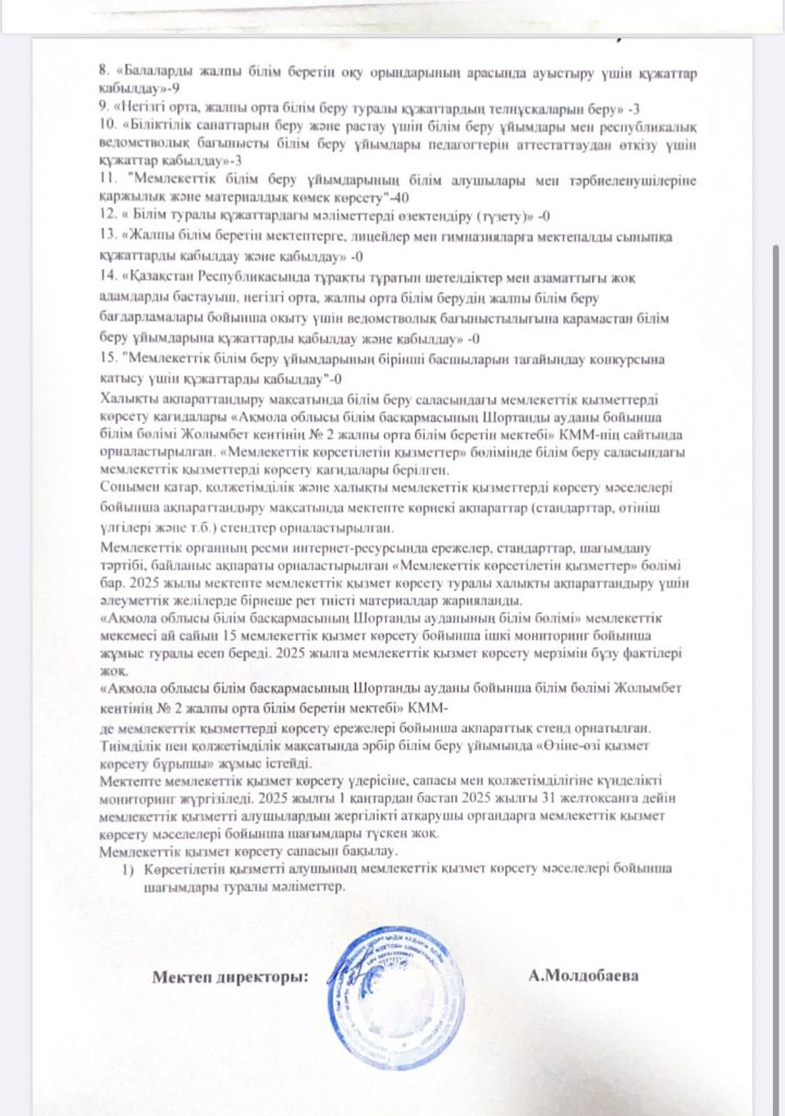 "Ақмола облысы білім басқармасының Шортанды ауданы бойынша білім бөлімі Жолымбет кентінің №2 жалпы орта білім беретін мектебі" КММ 2025 мемлекеттік қызмет көрсету сапасына жүргізілген қоғамдық мониторинг нәтижелері